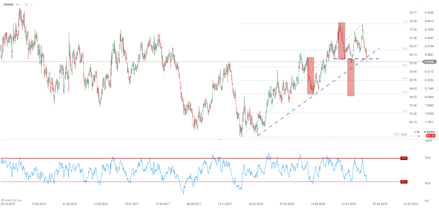NOK umacnia się po decyzji o podwyżce stóp procentowych i narusza ważne miejsce wsparcia wyznaczone przez wzrostową linię trendu oraz linię szyi formacji podwójnego szczytu. Sygnałem ostrzegawczym dla byków jest naruszenie poziomu RSI 33 punktów. Źródło: xStation