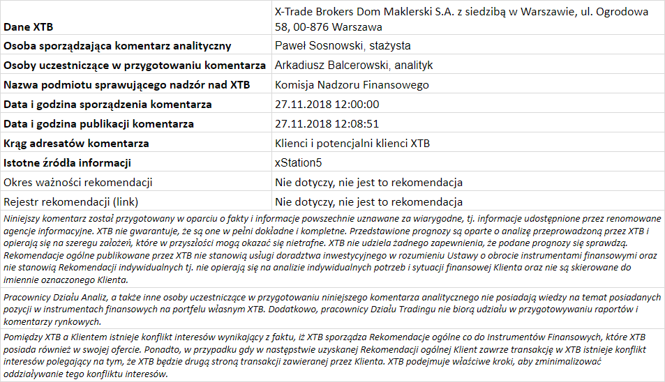 Ta publikacja handlowa jest informacyjna i edukacyjna. Nie jest rekomendacją inwestycyjną ani informacją rekomendującą lub sugerującą strategię inwestycyjną. W materiale nie sugerujemy żadnej strategii inwestycyjnej ani nie świadczymy usługi doradztwa inwestycyjnego. Materiał nie uwzględnia indywidualnej sytuacji finansowej, potrzeb i celów inwestycyjnych klienta. Nie jest też ofertą sprzedaży ani subskrypcji. Nie jest zaproszeniem do nabycia, reklamą ani promocją jakichkolwiek instrumentów finansowych. Publikację handlową przygotowaliśmy starannie i obiektywnie. Przedstawiamy stan faktyczny znany autorom w chwili tworzenia dokumentu. Nie umieszczamy w nim żadnych elementów oceniających. Informacje i badania oparte na historycznych danych lub wynikach oraz prognozy nie stanowią pewnego wskaźnika na przyszłość. Nie odpowiadamy za Twoje działania lub zaniechania, zwłaszcza za to, że zdecydujesz się nabyć lub zbyć instrumenty finansowe na podstawie informacji z tej publikacji handlowej. Nie odpowiadamy też za szkody, które mogą wynikać z bezpośredniego czy też pośredniego wykorzystania tych informacji. Inwestowanie jest ryzykowne. Inwestuj odpowiedzialnie.