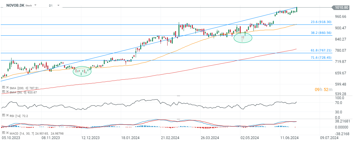 Akcje znanego duńskiego producenta leków na odchudzanie i cukrzycę typu II, Novo Nordisk (NOVOB.DK) osiągają obecnie rekordowe poziomy powyżej 1000 DKK za walor, po tym jak terapia odchudzająca Wegovy została zatwierdzona przez organy regulacyjne w Chinach.