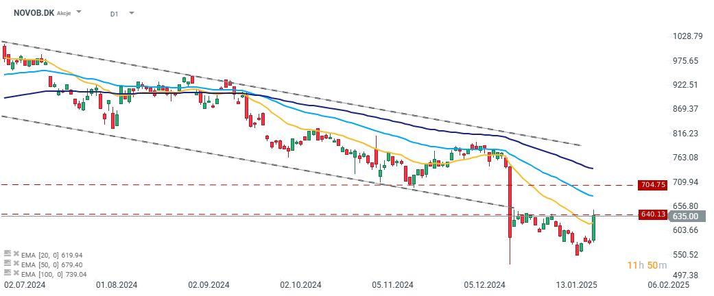Notowania spółki rosną o ponad 10% po informacji o sukcesie badań klinicznych. Novo Nordisk od połowy 2024 r. pozostaje w trendzie spadkowym, spadając w najgorszym momencie poniżej 550 DKK, czyli poziomu sprzed publikacji pierwszych znaczących badań dotyczących potencjalnego wpływu leku Wegovy na ograniczenie ryzyka chorób serca u pacjentów, które spółka zaprezentowała w sierpniu 2023 r. Źródło: xStation