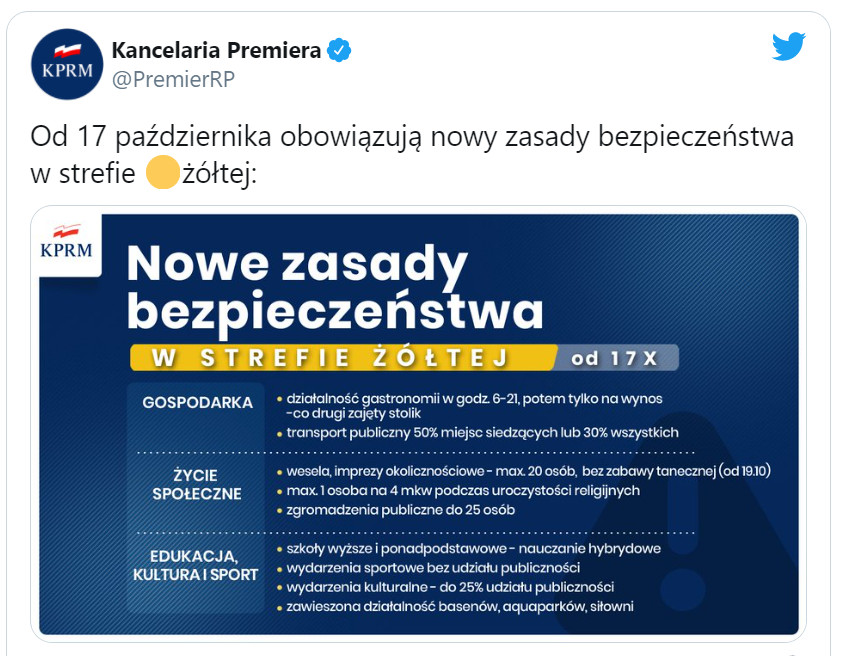 Podczas dzisiejszej konferencji prasowej premier i minister zdrowia przedstawili dalsze działania rządu odnośnie rozprzestrzeniające się pandemii koronawirusa. Wprowadzone zostały nowe ograniczenia strefach żółtej i czerwonej, część z nich zacznie obowiązywać od 17 października czyli już od soboty.