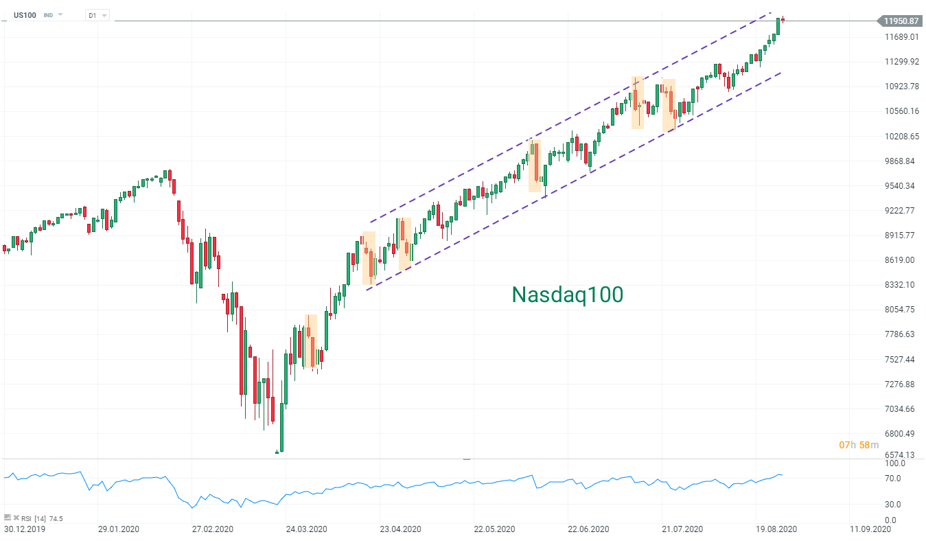 US500 oraz US100 wzrosły do nowych historycznych szczytów w trakcie przemowy szefa Fed, Jerome Powella. Bankier wskazał, że Fed będzie teraz celował w średnią inflację, co pozwoli na utrzymanie zerowych stóp procentowych przez dłuższy czas. Było to oczekiwane przez rynki, ale pozytywne ruchy są widoczne głównie na amerykańskich indeksach. US500 jest blisko 3500 punktów, natomiast US100 powyżej 12000 punktów, tuż przed lekkim cofnięciem w ostatnich minutach. Warto zauwazyć, że Nasdaq (US100) znajduje się blisko górnego ograniczenia bardzo stromego kanału trendowego.