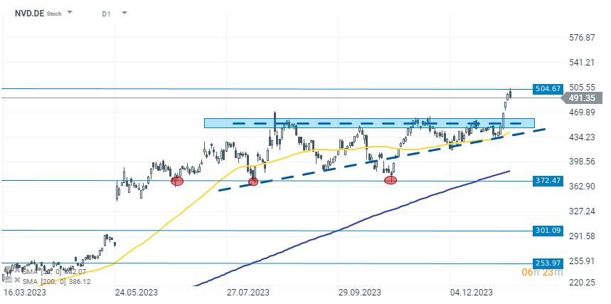 W dniu dzisiejszym Nvidia (NVDA.US) osiągnęła historyczne maksima po wybiciu się z formacji trójkąta wznoszącego się. Obecnie obserwujemy spowolnienie dynamiki wybicia. Obecnie pierwszym poziomem wsparcia jest górne ramię trójkąta na poziomie 455 dolarów. Biorąc pod uwagę niepewną sytuację na szerzej rozumianym rynku akcji, możliwe jest, że inwestorzy będą chcieli ponownie przetestować tę strefę. W tym przypadku kluczowe będzie jej utrzymanie.