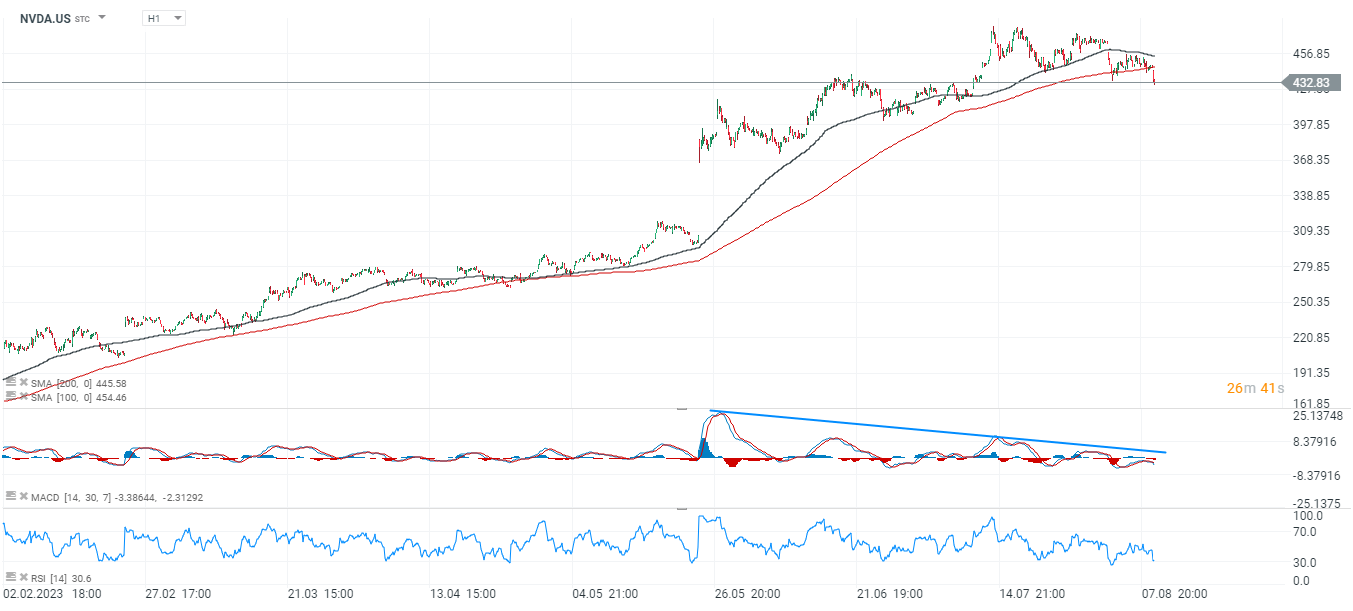 Akcje Nvidia (NVDA.US) wyłamują się stopniowo z dynamicznego wzrostu - widzimy sporą dywergencję między ceną a MACD. Źródło: xStation5