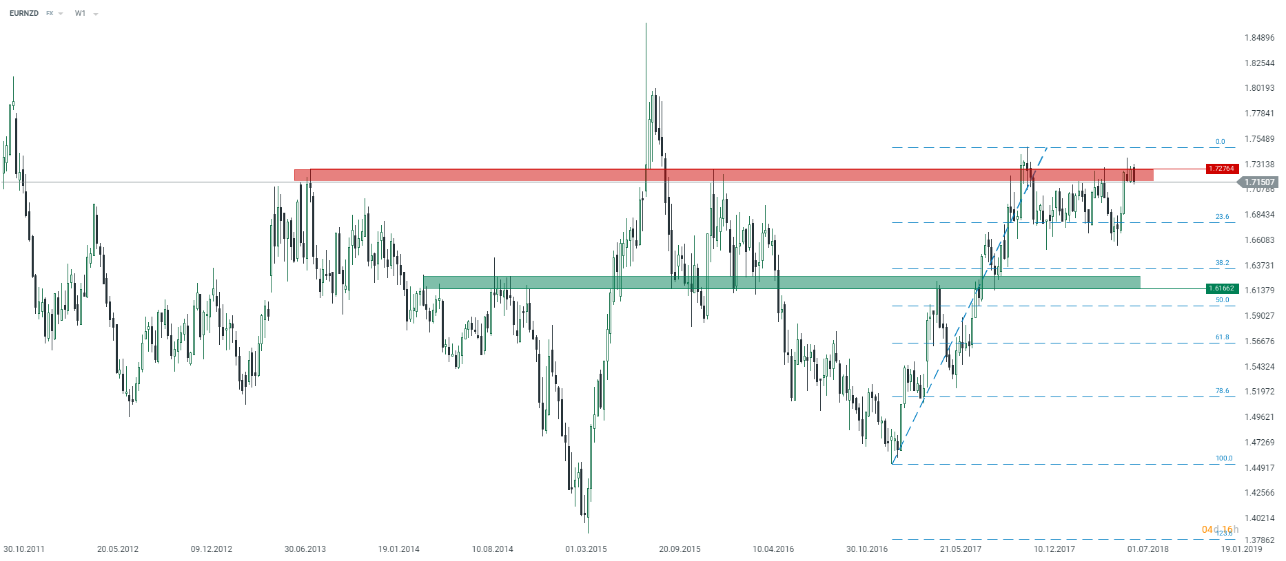 Patrząc na okazje rynkowe i obecną zmienność bardzo ciekawie prezentuje się para EURNZD. Już wcześniej było widać reakcję na strefę podażową, a obecnie możemy mieć do czynienia z objęciem bessy na parze. Zamknięcie poniżej dolnego ograniczenia strefy podażowej otworzy szanse na głębsze spadki, choć te powinny być ograniczone przez okolice zniesienia 23.6 ostatniej dużej fali wzrostowej, gdzie znajduje się dolne oograniczenie konsolidacji. Źródło: xStation5