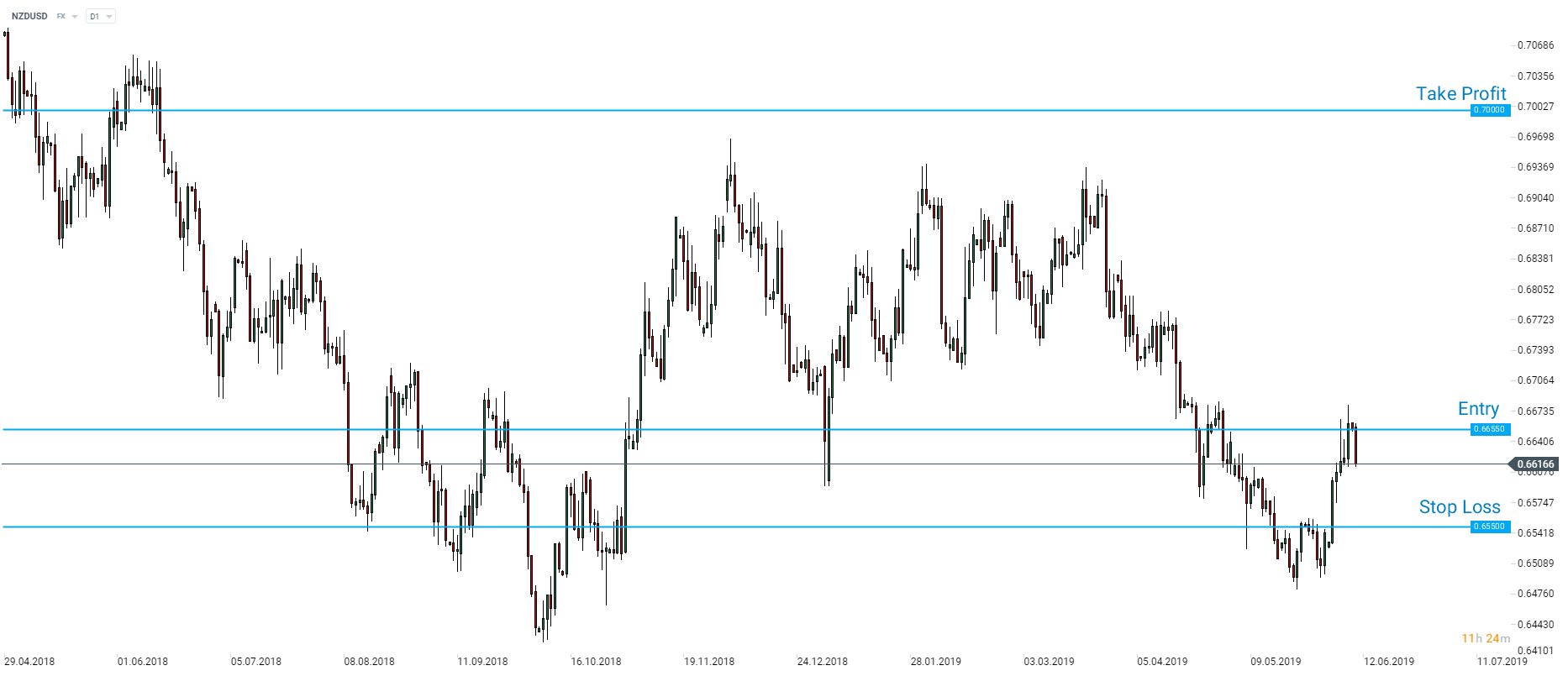 Goldman Sachs rekomenduje zajęcie długiej pozycji na NZDUSD po cenie rynkowej z celem przy 0,7000 i zleceniem stop loss ustawionym przy poziomie 0,6550. Źródło: xStation5