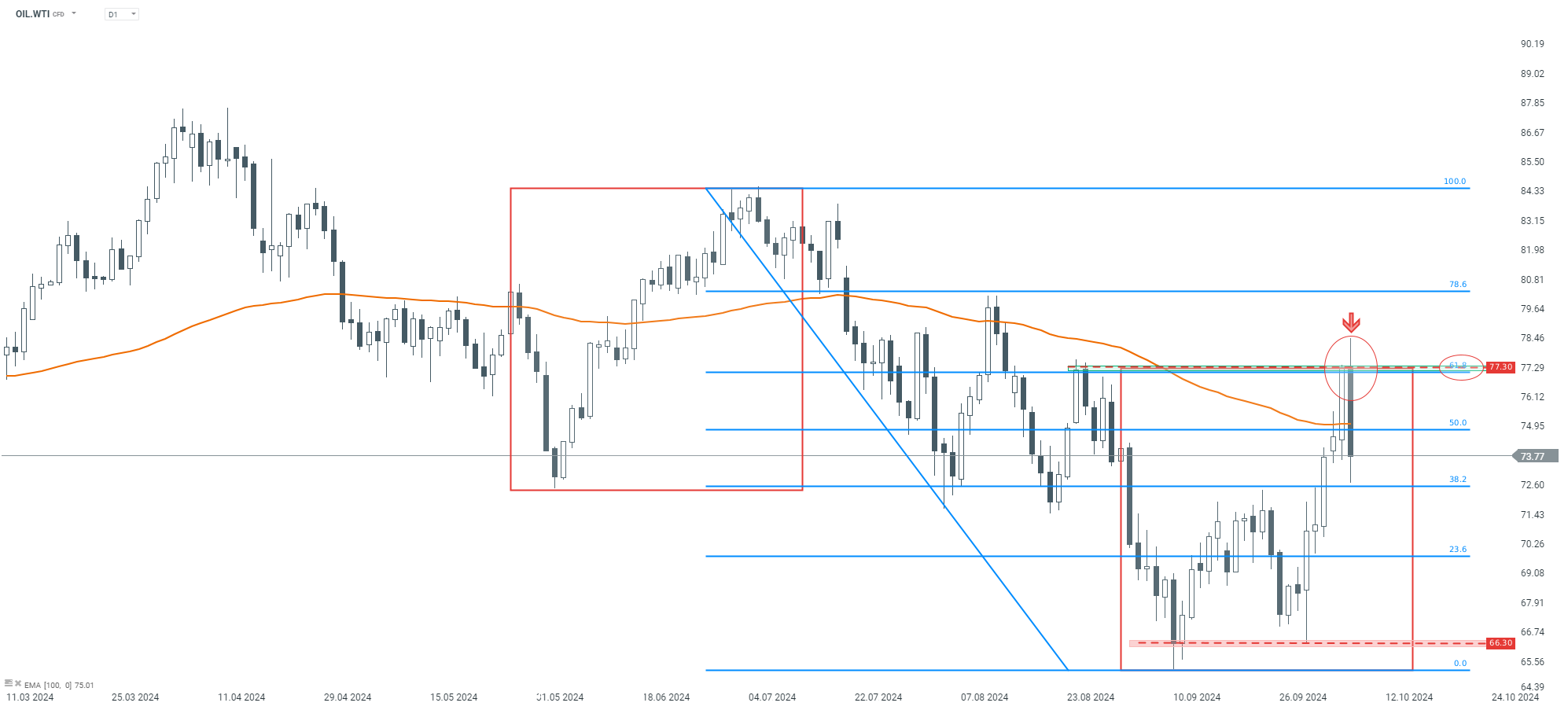 Notowania ropy WTI (OIL.WTI) od początku października notowały solidne wzrosty. Kurs dotarł już wczoraj do kluczowego oporu przy 77,30$, a dziś poziom ten został nieznacznie naruszony. Niemniej dalsza część dnia przyniosła cofnięcie, przez co na interwale D1 tworzy się formacja objęcia bessy. Kurs nie tylko odbił się od szerokiej geometrii 1:1, ale także wrócił poniżej średniej EMA100, co może zachęcać sprzedających do większej aktualności. Zgodnie z metodologią Overbalance, obowiązuje trend spadkowy.