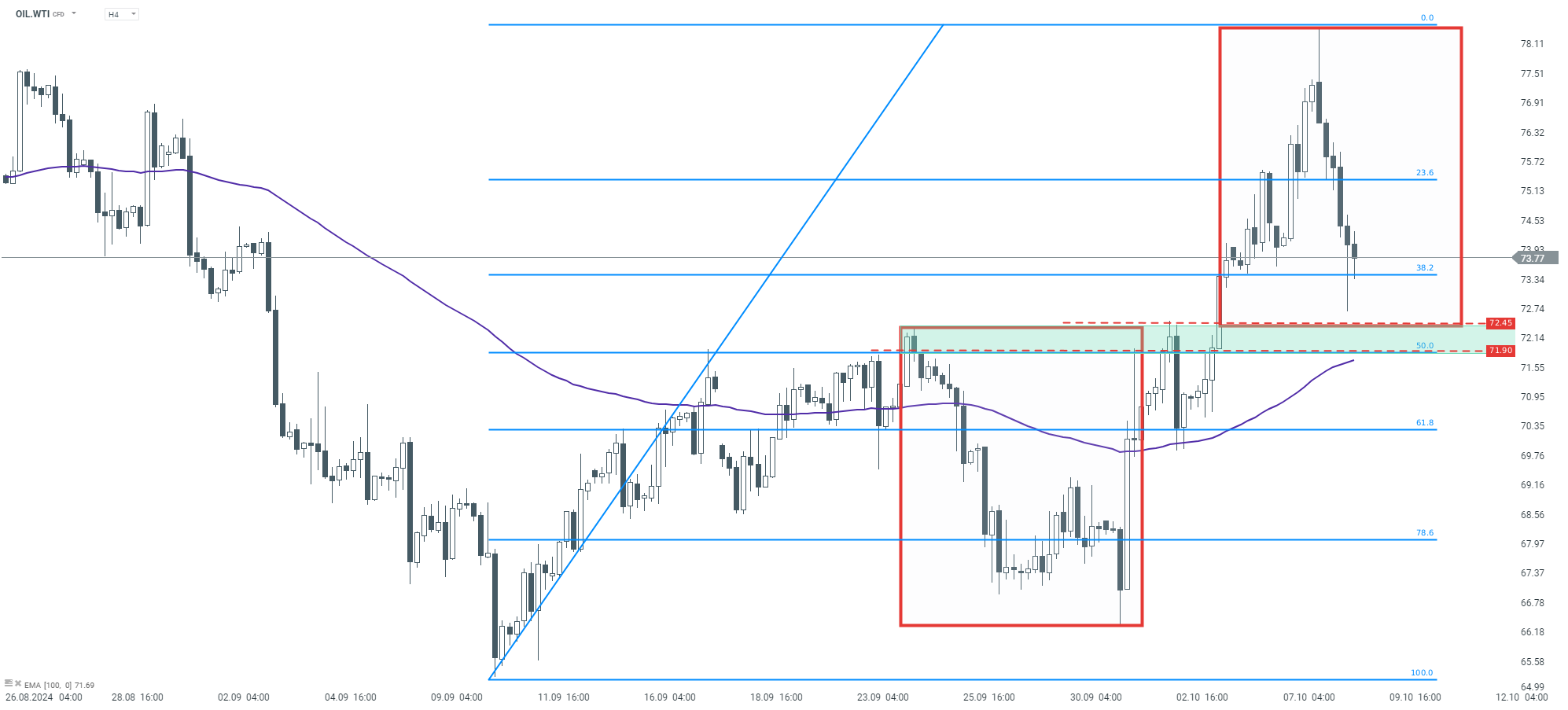 Patrząc na niższy interwał czasowy - H4, należy zwrócić uwagę na kluczową strefę oporu, rozciągającą pomiędzy poziomem 71,90$, a 72,45$. Obszar zaznaczony kolorem zielonym wynika z dolnego ograniczenia układu 1:1, wcześniejszych reakcji cenowych, średniej EMA100 oraz mierzenia 50%ostatniej fali wzrostowej. W przypadku wybicia poniżej, droga do dalszych spadków zostanie otwarta. W przeciwnym razie, odbicie w tym miejscu może prowadzić do wznowienia ruchu w kierunku dzisiejszych maksimów.