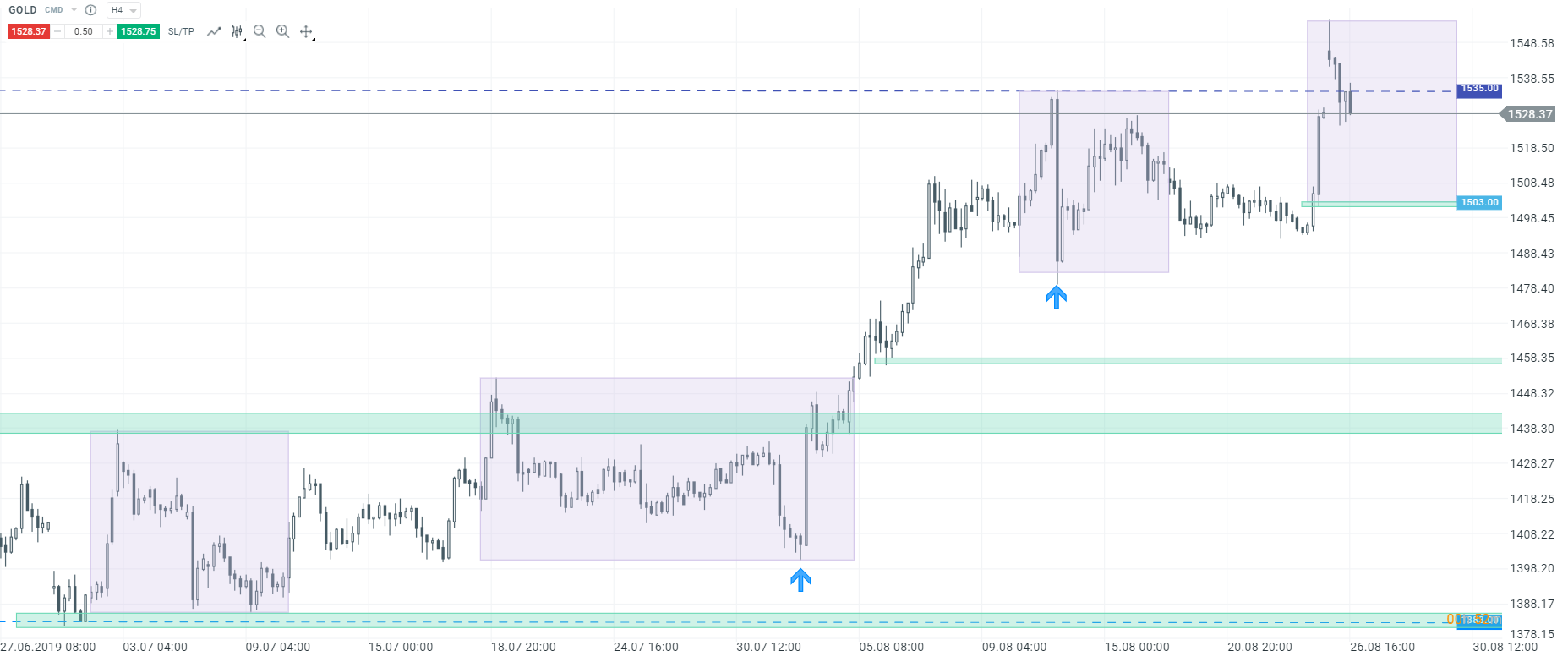 Dzisiejsze nieco lepsze nastroje na rynku akcji prowadzą do korekty na rynku złota. Wpływ na taką kolej rzeczy ma oczywiście poprawa relacji na linii USA - Chiny, podczas weekendowego szczytu G7 Donald Trump zapowiedział, że zamierza rozmawiać z Chinami i być może nawet wycofa się z deklaracji o podwyższeniu opłat celnych. Podczas gdy indeksy odrabiają piątkowe straty, cena złota wraca poniżej szczytów z 13 sierpnia. Dzisiejsza sesja rozpoczęła się co prawda od luki wzrostowej, niemniej od początku handlu kierunek na złocie jest południowy. Jeśli chodzi o sytuację techniczną na interwale czasowym H4, dzisiejsze spadki są jedynie korektą w długotrwałym trendzie wzrostowym. Pomimo cofnięcia z tegorocznych szczytów, nie widać większych zagrożeń dla kupujących. Aktualnie możliwe jest zejście w okolice dolnego ograniczenia układu 1:1 - poziom 1503$, jednak dopóki nie zostanie on pokonane, obowiązuje trend zwyżkujący.