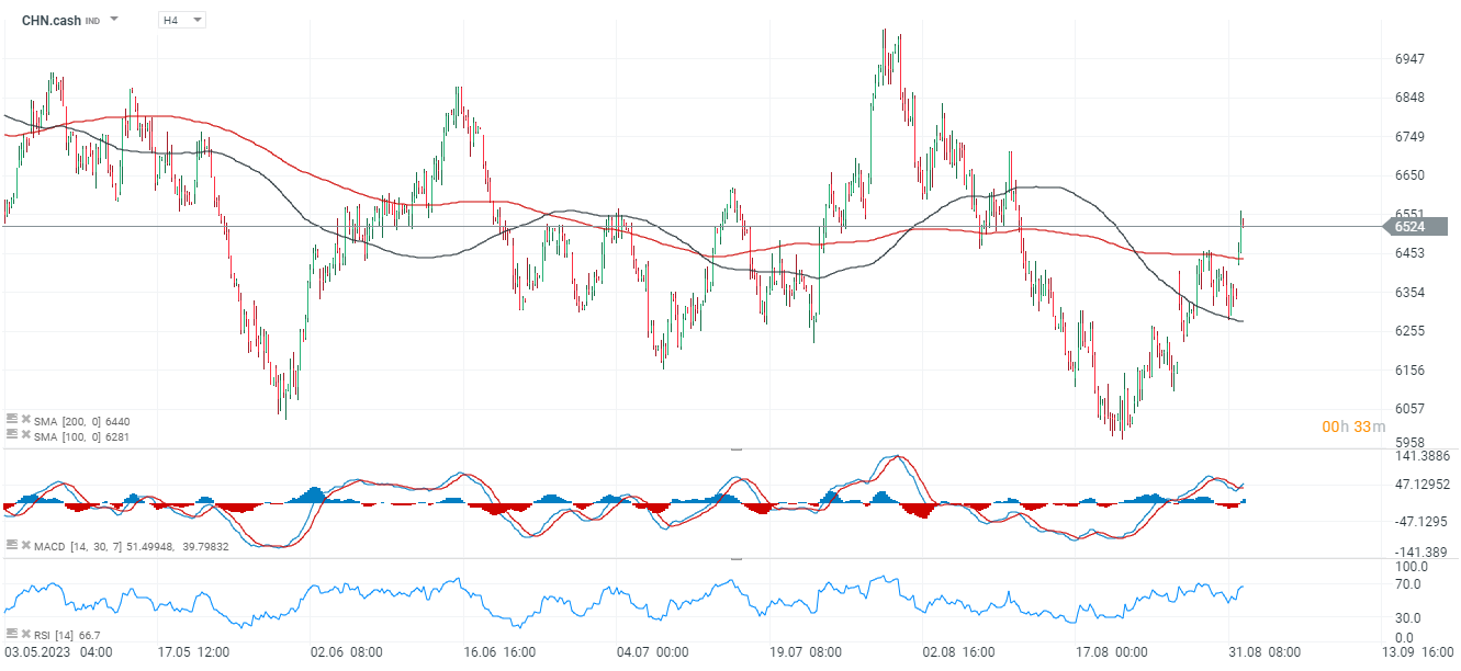 Patrząc na indetwrał H4 na CHN.cash widzimy, że MACD znacznie poprawiło się odbijając z poziomu wyprzedania, a cena wzrosła powyżej SMA200 i SMA100 na interwale H4 wskazując na możliwy test 7000 pkt, jeśli pozytywne momentum trwać miałoby dłużej a indeks dolara mocniej się osłabić.