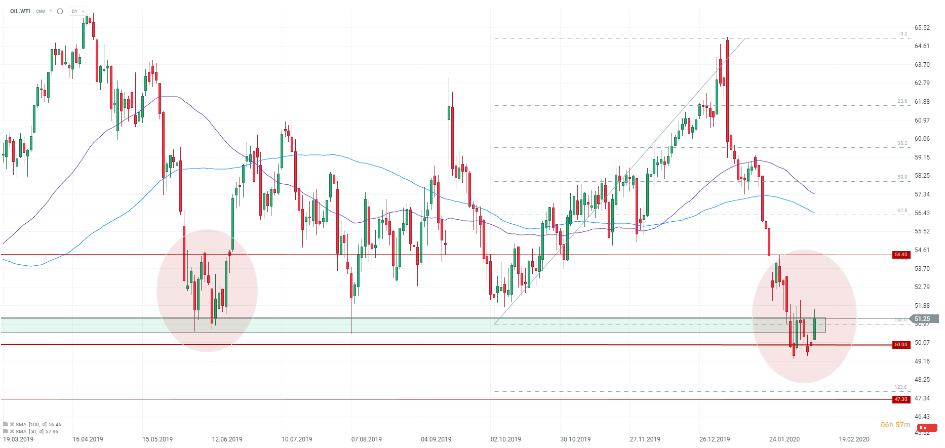 Wyraźny wzrost zapasów w pierwszym momencie nie wpłynął na ceny. Kilkanaście minut później ropa cofa się jednak z okolic poziomu 51,50. Zejście poniżej określonej zielonym prostokątem strefy popytowej może być traktowane jako niedźwiedzi sygnał, choć w tym momencie ropa wydaje się być nadmiernie wyprzedana. Źródło: xStation5