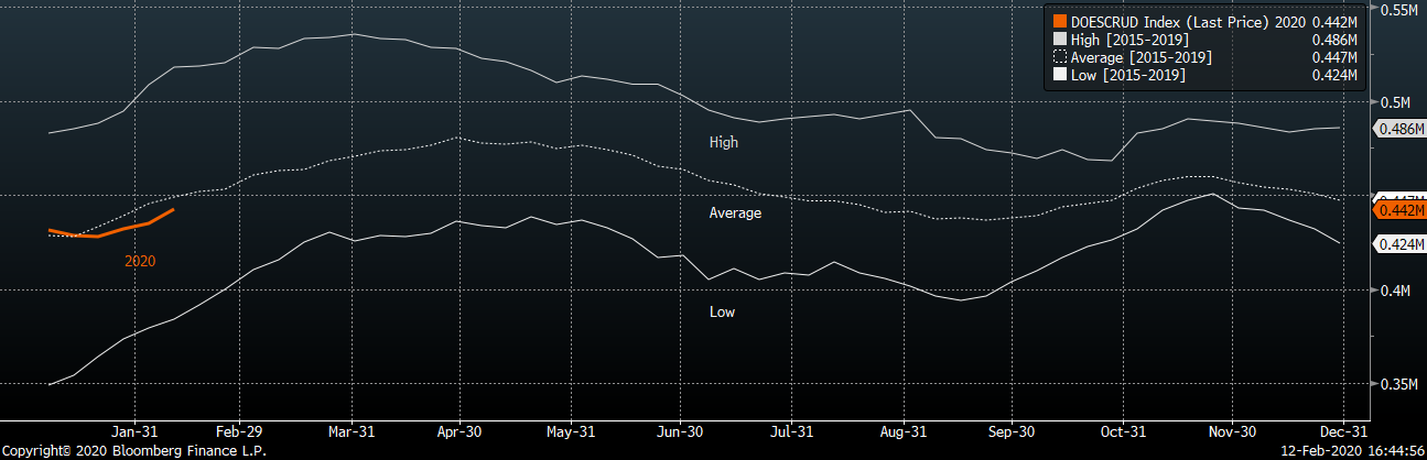 Wzrost zapasów postępuje zgodnie z sezonowością. Źródło: Bloomberg