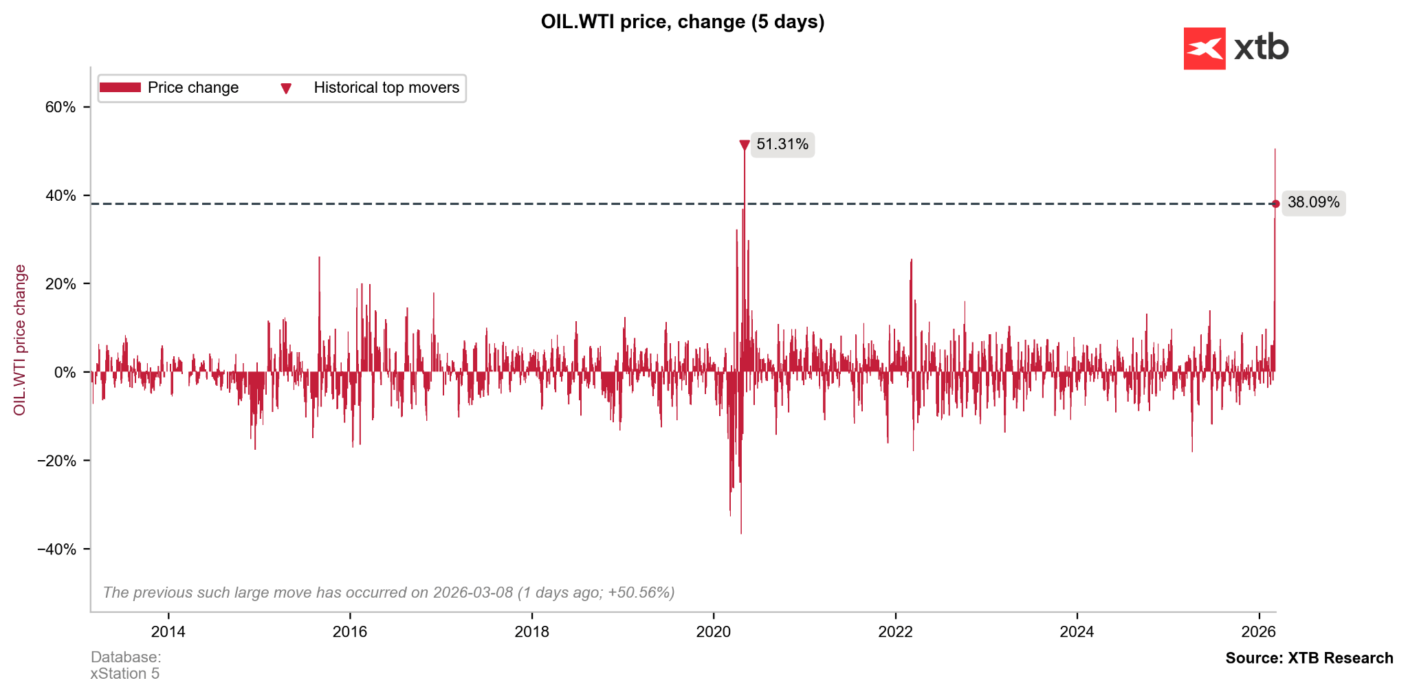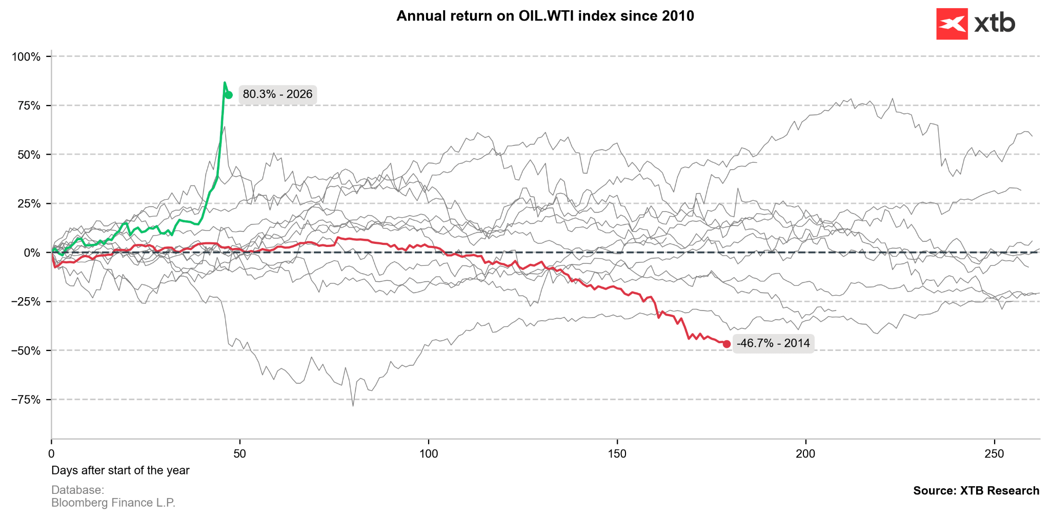 Ropa WTI od początku roku zyskuje już ponad 80% i jest to największy szok cenowy w analizowanym okresie.