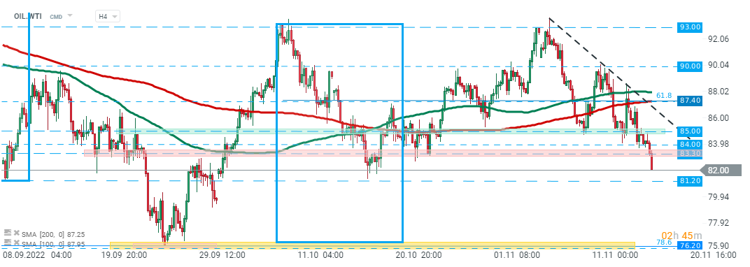 OIL.WTI przełamał się poniżej głównego wsparcia na poziomie 83,30 USD, które jest tworzone w oparciu o wcześniejsze reakcje cenowe i jeśli obecny sentyment się utrzyma cena może zmierzać w kierunku kluczowego wsparcia na poziomie 81,20 USD, gdzie znajdziemy październikowe minima. Jeśli niedźwiedziom uda się przełamać niżej, ruch spadkowy może zaakcentować się w kierunku 76,20 USD, który wyznacza dolne ograniczenie struktury 1:1 oraz 78,6 zniesienie Fibonacciego fali wzrostowej zapoczątkowanej w grudniu 2021 roku. Źródło: xStation5