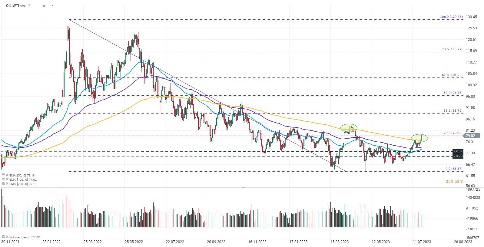 Notowania OIL.WTI wybijają się powyżej 200-dniową, wykładniczą średnią kroczącą (EMA200, złota linia) i w chwili obecnej testują opory wyznaczone przez zniesienie 23,6% Fibo fali spadkowej zapoczątkowanej w kwietniu 2022 roku. Źródło: xStation