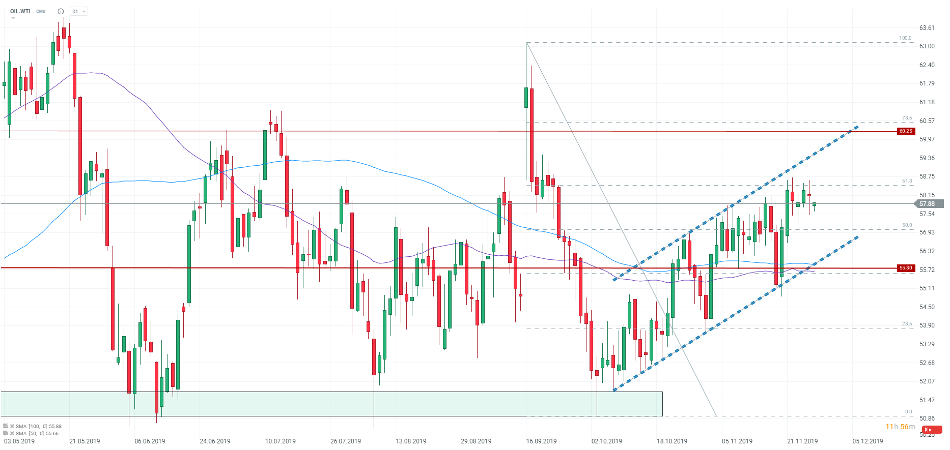 Ropa konsoliduje się obecnie blisko poziomu 58,00 USD za baryłkę, na tydzień przed posiedzeniem OPEC. Źródło: xStation5