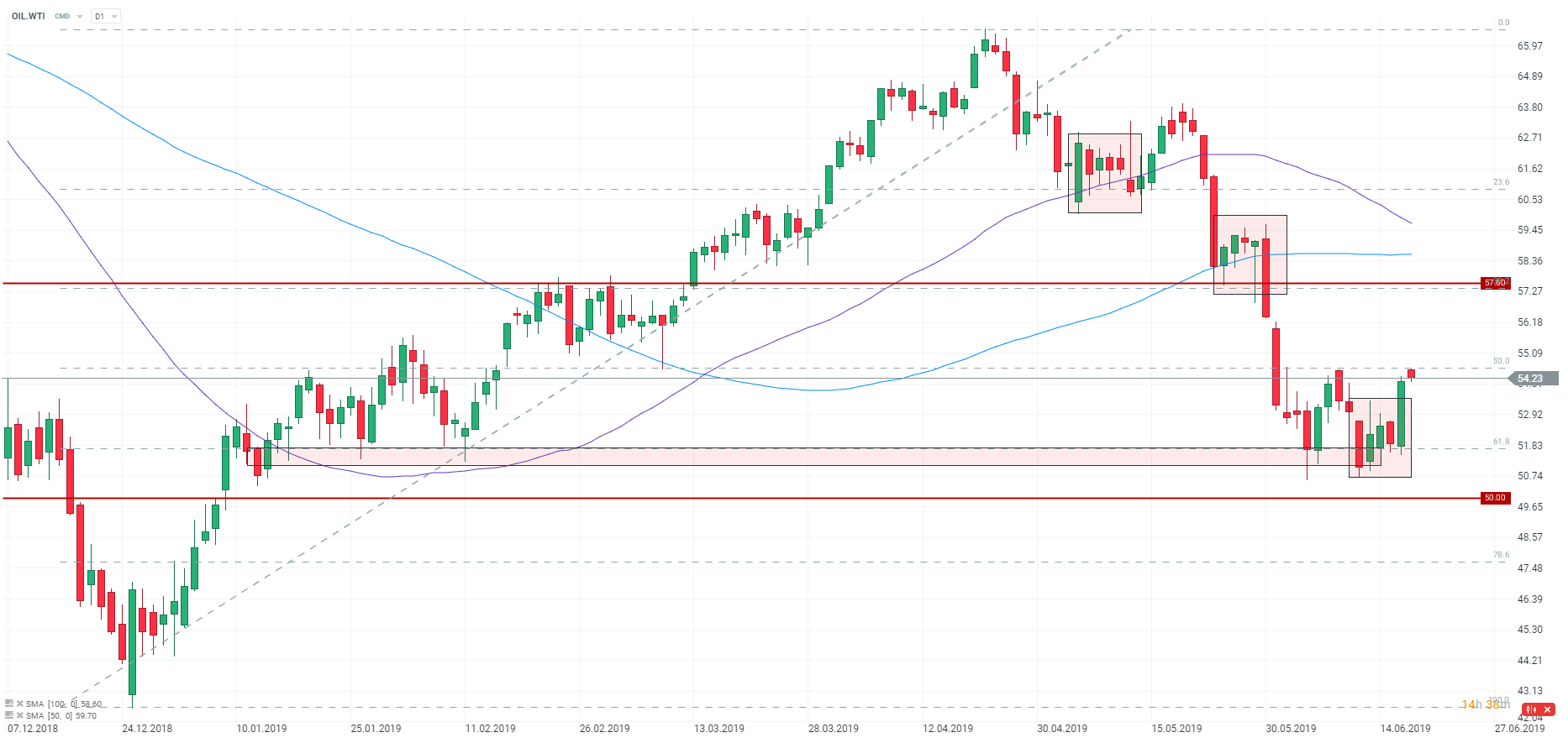 Ropa naftowa odwraca po dzisiejszym otwarciu luką wzrostową. Oporem pozostaje zniesienie 50.0. Źródło: xStation5