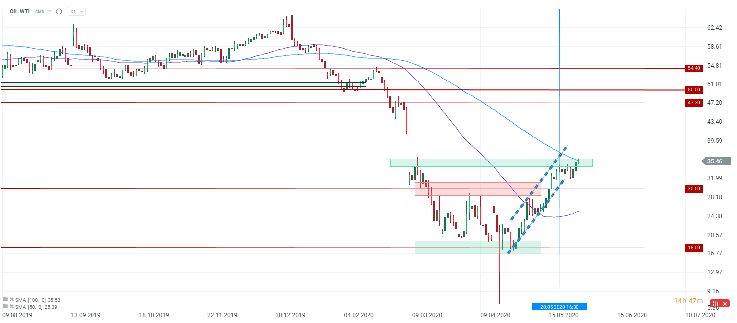 Ropa WTI przymierza się do testowania bardzo ważnej strefy oporu związanej z luką bessy z marca (wtedy OPEC nie zdecydował się na cięcia) oraz ze średnią 100 okresową na interwale dziennym. Źródło: xStation5