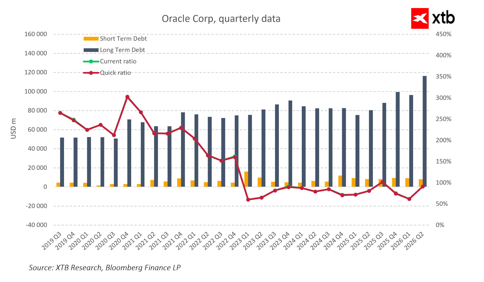 Oracle przeszedł z pozycji relatywnie umiarkowanie zadłużonej firmy software’owej do jednego z najbardziej zlewarowanych graczy wśród wielkiej technologii. Dług długoterminowy wzrósł z około 55–60 mld USD w latach 2019–2020 do około 115–120 mld USD w Q2 FY2026. Rosnący koszt długu oraz wyższa premia za ryzyko nakładana przez rynek kredytowy sprawiają, że bilans firmy jest obecnie obarczony wyższym ryzykiem.