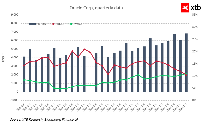 EBITDA rośnie praktycznie nieprzerwanie, od około 4 mld USD na kwartał w latach 2019–2020 do niemal 7 mld USD w Q2 FY2026, a tempo wzrostu przyspiesza w okresie, gdy rosną przychody segmentu chmurowego, co potwierdza skalowalność modelu cloud. ROIC przez większość okresu utrzymuje się wyraźnie powyżej WACC, co oznacza, że Oracle historycznie tworzyło wartość dla akcjonariuszy. Różnica między ROIC a WACC była szczególnie wysoka w latach 2020–2022. W ostatnich kwartałach widać jednak stopniowe zawężanie spreadu. ROIC spada z poziomów powyżej 20% do kilkunastu procent, podczas gdy WACC lekko rośnie wraz z wyższymi stopami procentowymi i narastającym zadłużeniem. Jest to wyraźna sygnalizacja, że rosnące nakłady kapitałowe na AI i infrastrukturalna rozbudowa zaczynają obniżać efektywność wykorzystania kapitału.