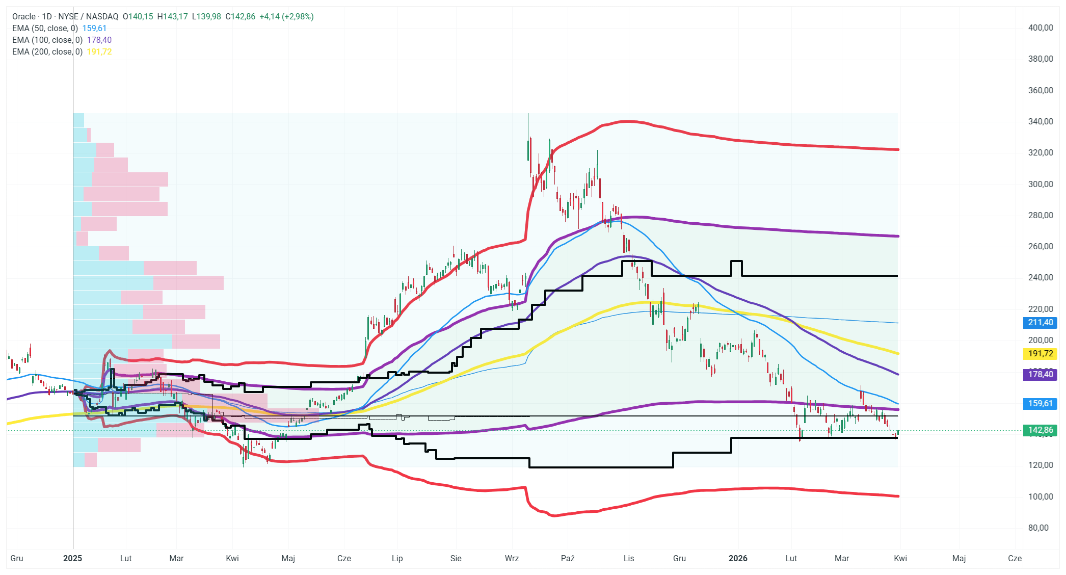 Paradoks całej sytuacji jest jednak uderzający. Oracle zwalnia ludzi po to, by sfinansować technologię, która te miejsca pracy stopniowo eliminuje. Nie jest to odosobniony przypadek, ale część szerszego trendu w branży technologicznej, gdzie kolejne korporacje dokonują podobnych wyborów strategicznych. Inwestorzy podchodzą do tej transformacji relatywnie optymistycznie, czego dowodem jest dzisiejsze blisko 3% odbicie kursu cen akcji firmy. Rynek w długim terminie jednak wycenia ryzyko konkurencji w obszarze generatywnej AI oraz niepewność co do tego, kiedy gigantyczne nakłady infrastrukturalne zaczną realnie przekładać się na wolne przepływy gotówkowe generowane w przyszłości. To właśnie ta kwestia powoduje, że Oracle notowany jest w obecnym trendzie spadkowym.