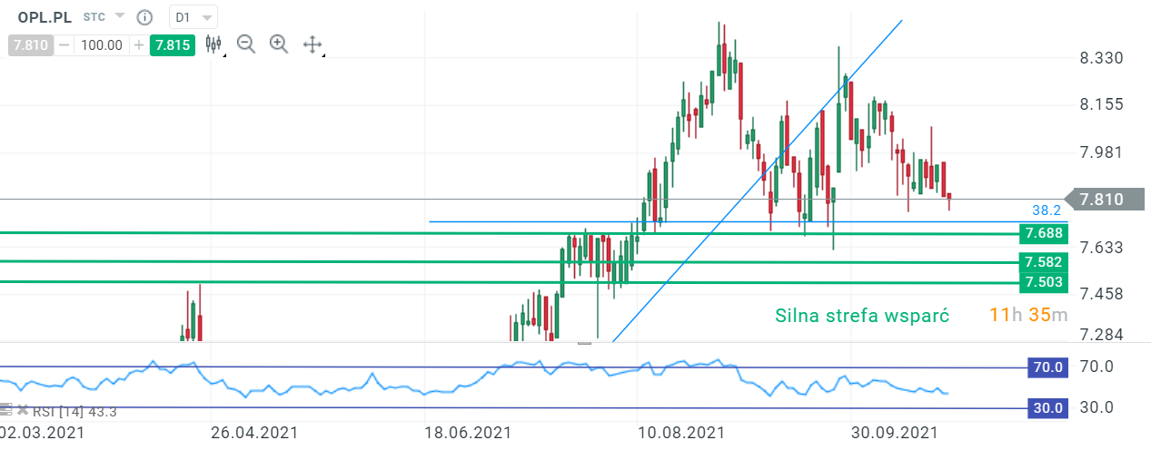 Wykres techniczny spółki Orange (OPL.PL), strefa ważnych wsparć. Źródło: xStation 5