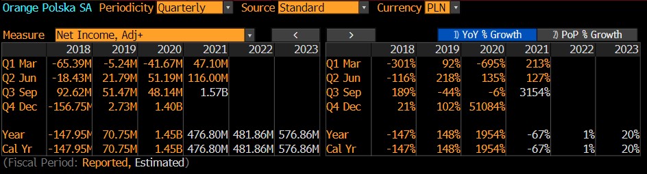 Tabela zysków netto spółki Orange (OPL.PL), kwartał. Źródło: Bloomberg