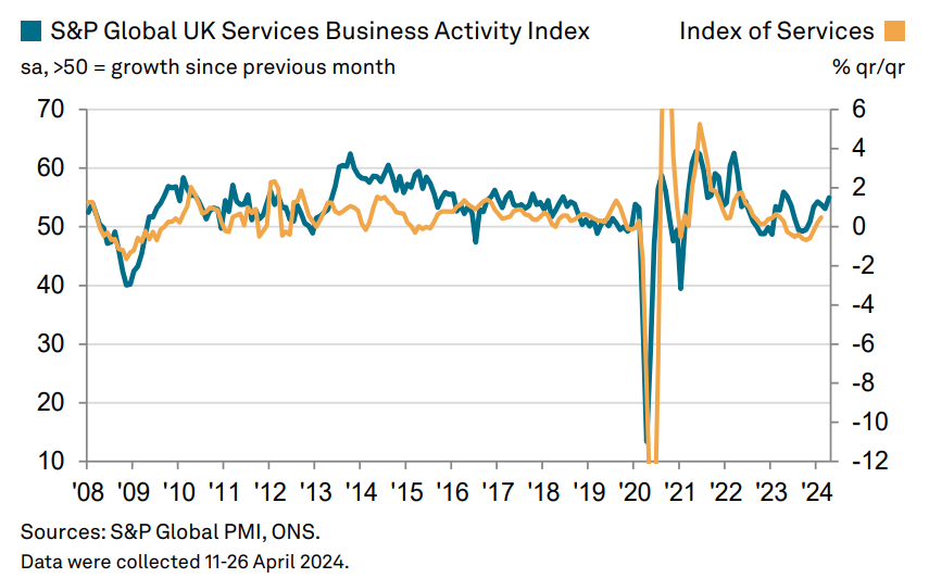 Brytyjscy dostawcy usług odnotowali solidne ożywienie w działalności biznesowej w kwietniu, wspierane przez ponowne wzmocnienie portfeli zamówień. Ożywienie jednak przebiegało w środowisku maksymalizacji marży firm, o czym świadczą słabe dane o zatrudnieniu i inflacji kosztów.
