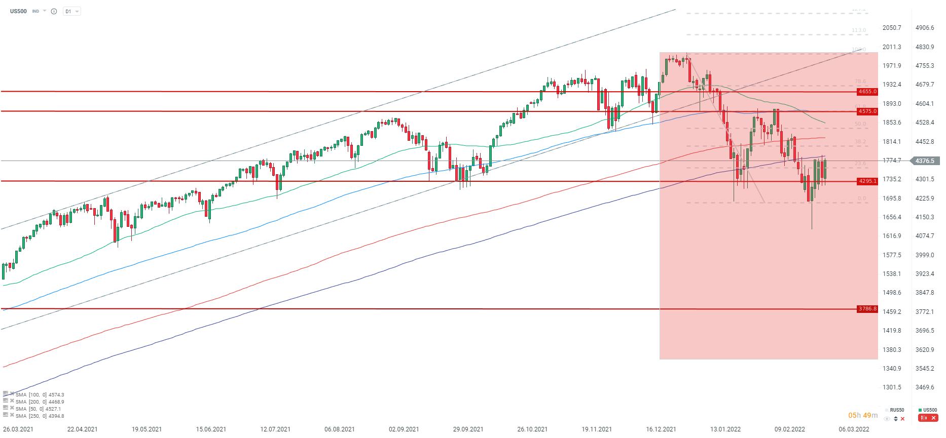 US500 ponownie testuje okolice 250 sesyjnej średniej. Źródło: xStation5
