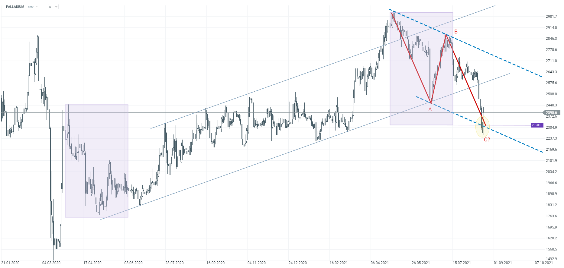 Jeśli chodzi o sytuację techniczną, obserwujemy powrót ceny powyżej kluczowego poziomu wsparcia przy 2320$. Miejsce to wynika z dolnego ograniczenia lokalnego kanału spadkowego, a także szerokiej korekty 1:1 (fioletowe prostokąty). Ponadto ostatni ruch spadkowy przypomina korektę prostą ABC.