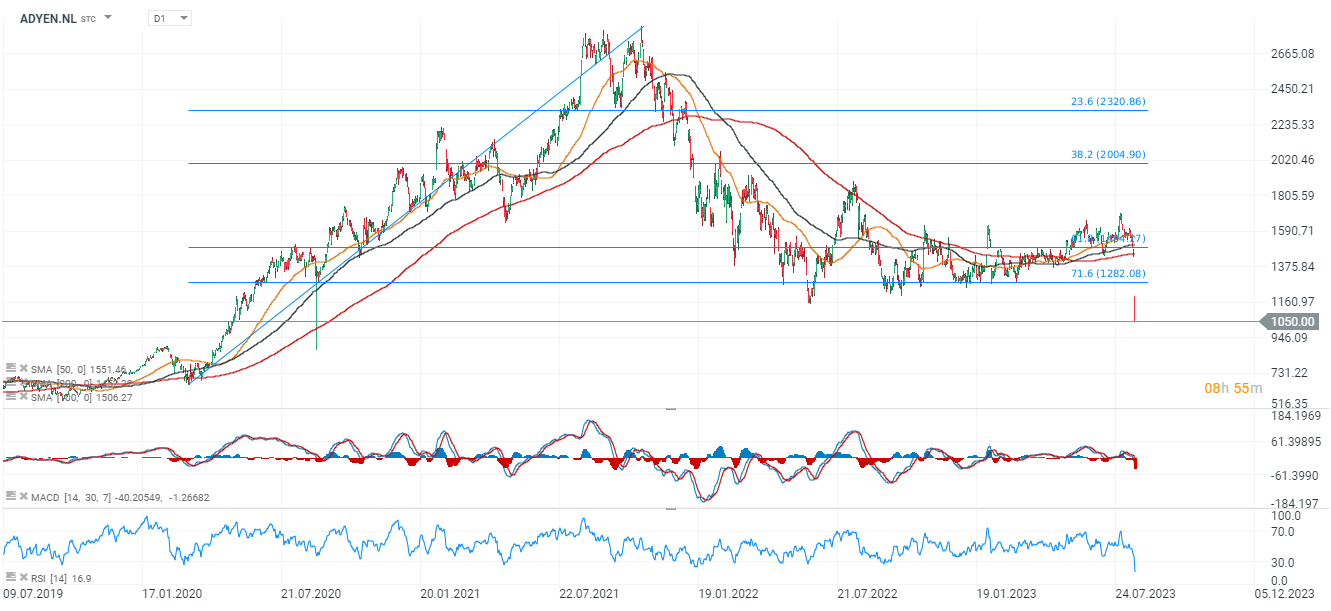 Akcje holenderskiej firmy z branży cyfrowych płatności Adyen NV (ADYEN.NL) tracą dziś potężnie ponieważ raport za II kw. nie spełnił oczekiwań rynku. Rosnąca konkurencja w Ameryce Północnej przyczyniła się do najwolniejszego wzrostu przychodów od czasu ICO co stało się powodem wymazania dziś blisko 12 mld EUR kapitalizacji firmy w ciągu jednej sesji. Spółka była notowana ze sporą premią od strony wyceny na tle konkurencji takiej jak PayPal (PYPL.US) czy Block (SQ.US). Po raporcie za II kw. inwestorzy dostosowują wycenę do niższych miar wzrostu (W I połowie 2022 roku przychody rosły w tempie 37% r/r). Firma pośredniczy w usługach płatniczych gigantów jak Meta Platforms, Microsoft czy Netflix.