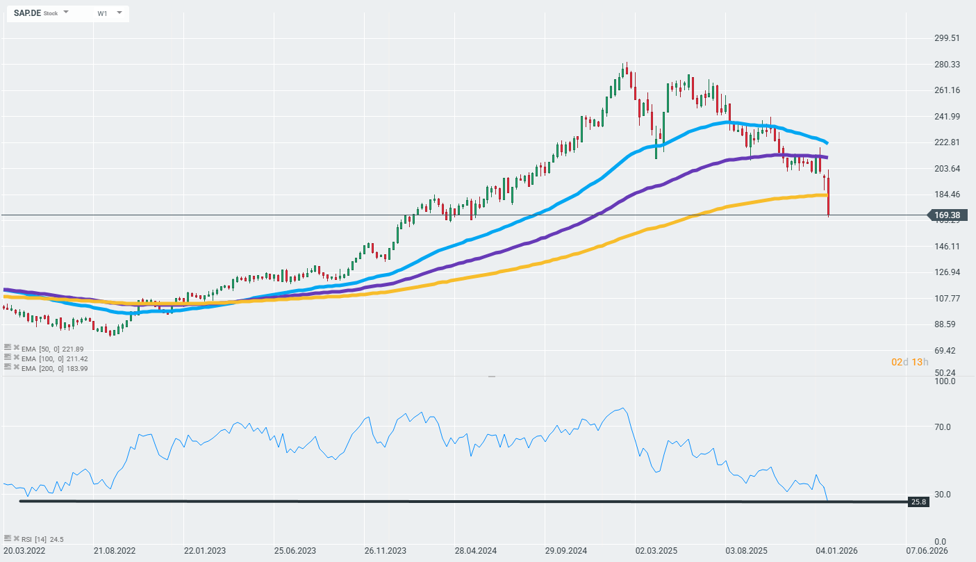 Spółka SAP (SAP.DE), która jest jedną z 3 największych europejskich spółek giełdowych opublikowała wyniki za IV kwartał, które rozczarowały inwestorów głównie słabszym wzrostem bieżącego backlogu chmurowego, co wywołało gwałtowny spadek akcji. Mimo pewnych pozytywnych elementów, jak wzrost przychodów chmurowych i zyskowność, rynek zareagował negatywnie z powodu obaw o spowolnienie wzrostu i konkurencję AI. Akcje w chwili obecnej notowane są prawie 14% niżej względem wczorajszych zamknięć i na najniższych poziomach widzianych od maja 2024 roku.