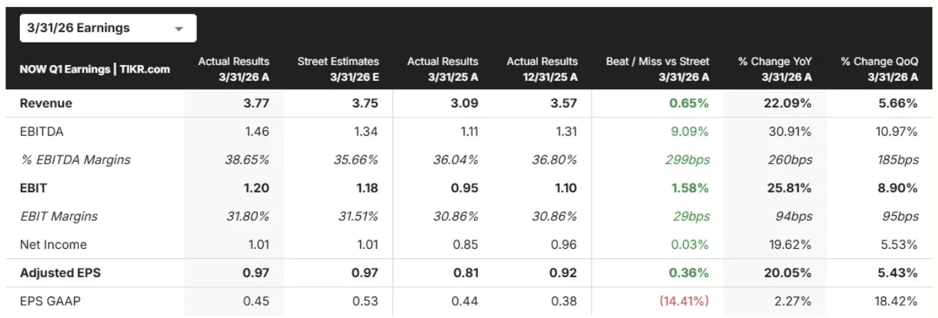 Kluczowym punktem raportu okazały się przychody subskrypcyjne, czyli najważniejsza część modelu biznesowego ServiceNow. Wyniosły one 3,67 mld USD, co formalnie oznaczało niewielkie pobicie oczekiwań i wzrost o 22% rok do roku. Problem polegał jednak na tym, że inwestorzy liczyli na coś wyraźnie mocniejszego. Zarząd tłumaczył, że około 75 punktów bazowych wzrostu zostało utraconych przez opóźnienia w finalizacji kilku dużych kontraktów on-premise na Bliskim Wschodzie, co miało związek z konfliktem w regionie. Fundamentalnie brzmi to jak przesunięcie w czasie, a nie oznaka słabnącego popytu, ale rynek w obecnym otoczeniu reaguje bardziej na tempo niż na niuanse.