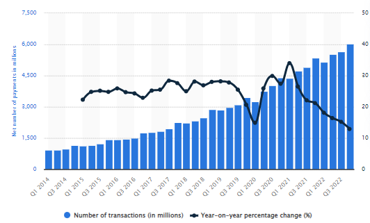 Ilość transakcji przetwarzanych przez PayPal rośnie wykładniczo ale tempo wzrostu r/r zwalnia nieprzerwanie od I kw. 2021 roku. Wobec tego inwestorzy obawiają się, że firma jest bliska wyczerpania swojego wzrostowego potencjału. Źródło: Statista