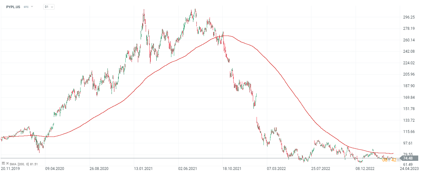 Wykres PayPal (PYPL.US), interwał D1. Głównym poziomem oporu wydaje się być SMA200 (czerwona linia), która przebiega przy 81 USD. Wybicie powyżej niej mogłoby stanowić sygnał zmiany momentum na pozytywne. Źródło: xStation5