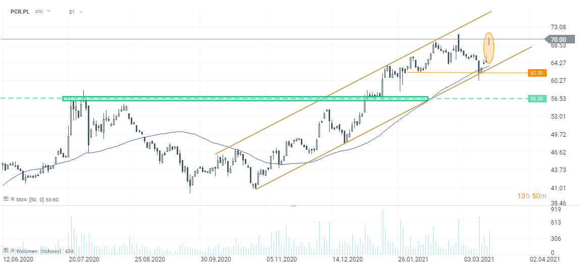 PCC Rokita (PCR.PL) przedstawiła raport roczny po zakończeniu wczorajszej sesji. Wyniki grupy chemicznej za 4Q 2020 istotnie przewyższyły oczekiwania rynku, stąd kurs otworzył się dziś od luki wzrostowej rzędu 7%. W czwartym kwartale spółka miała 125,2 mln PLN zysku EBITDA (+105,2% r/r) wobec konsensusu PAP wynoszącego 74,2 mln PLN. Zysk netto j.d. wyniósł 58 mln PLN, co stanowi wzrost aż o 316,7% r/r (rynek spodziewał się 25 mln PLN zysku netto).