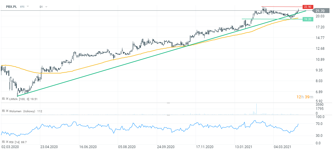Pekabex (PBX.PL) zyskuje ponad 3% w trakcie dzisiejszej sesji. Producent konstrukcji prefabrykowanych przedstawił wczoraj dwa komunikaty, z czego jeden po zamknięciu sesji kasowej. Pierwsza informacja to miesięczny raport wielkości produkcji, który wskazał, że łączna wielkość produkcji w zakładach należących do grupy kapitałowej wyniosła w marcu 2021 roku 25 559 m3 - rekordowy miesięczny wynik na tle ostatnich kilku lat. W lutym 2021 było to 15 302 m3, a w marcu ubiegłego roku: 16 661 m3. Drugi komunikat dotyczy zawarcia znaczącej umowy, której wartość stanowi 4% przychodów grupy wg ostatniego rocznego skonsolidowanego sprawozdania finansowego - spółka dość często informuje o tego typu umowach.