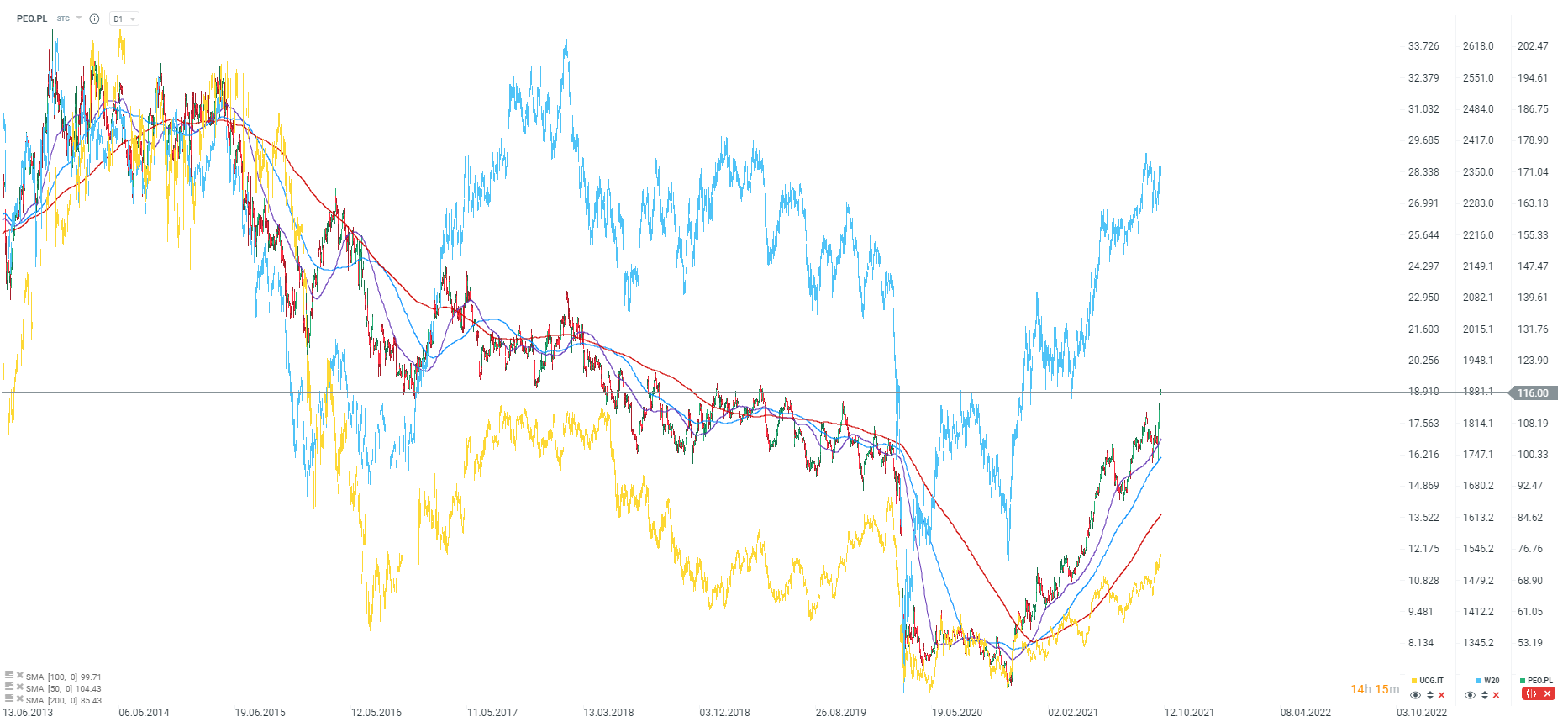 Pekao zyskuje, jednak na tle WIG20 obecne odbicie wygląda jeszcze na umiarkowane. Z drugiej strony na tle poprzedniego właściciela banku, czyli UniCredit, wzrosty na Pekao wyglądają naprawdę solidnie. Źródło: xStation5