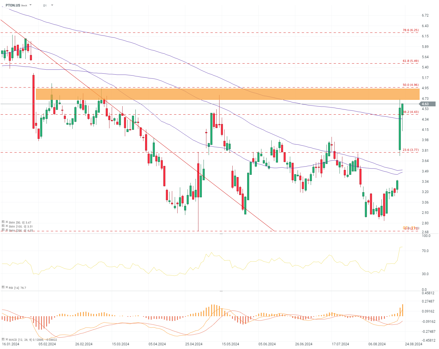 Akcje Peloton spadają o ponad 3% na początku ostatniej sesji w tygodni, po wczorajszym imponującym wzroście o 35%. Wynika to z lepszych niż oczekiwano wyników za czwarty kwartał i silnych prognoz zysku na rok fiskalny 2025, co świadczy o postępach w działaniach naprawczych.