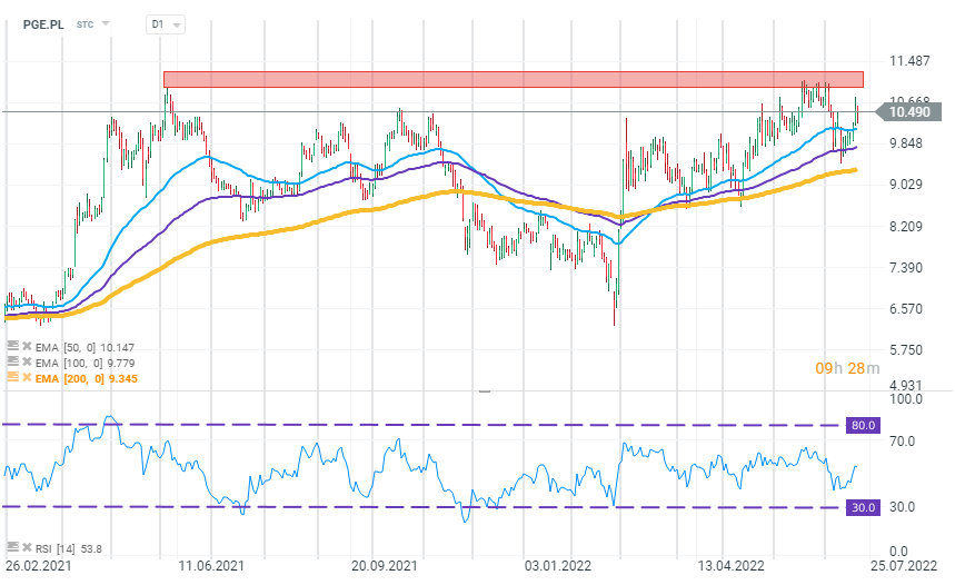 Wykres notowań spółki PGE (PGE.PL), interwał D1. Z technicznego punktu widzenia obecnie za lokalną strefę oporów uchodzi obszar 11 zł za walor, który był testowany przez byki dwukrotnie w perspektywie ostatnich 2 miesięcy. Za lokalne wsparcia inwestorzy mogą w chwili obecnej przyjąć wykładnicze, średnie kroczące. Źródło: xStation 5