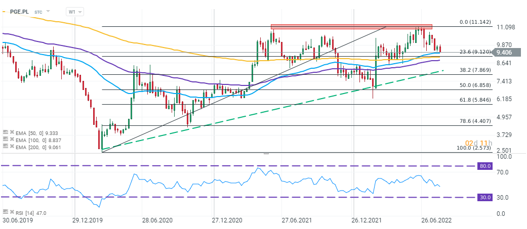 Wykres walorów PGNiG (PGN.PL), interwał W1. W chwili obecnej walory testują rejon wsparć wyznaczonych przez 50-, 100- oraz 200- tygodniowe wykładnicze średnie kroczące (odpowiednio niebieska, fioletowa oraz złota krzywa). Ważnym punktem wsparcia jest również zniesienie 23,6% Fibo (blisko 9,12 zł za akcję). Lokalnym oporem pozostaje obszar ostatnich szczytów. Źródło: xStation 5
