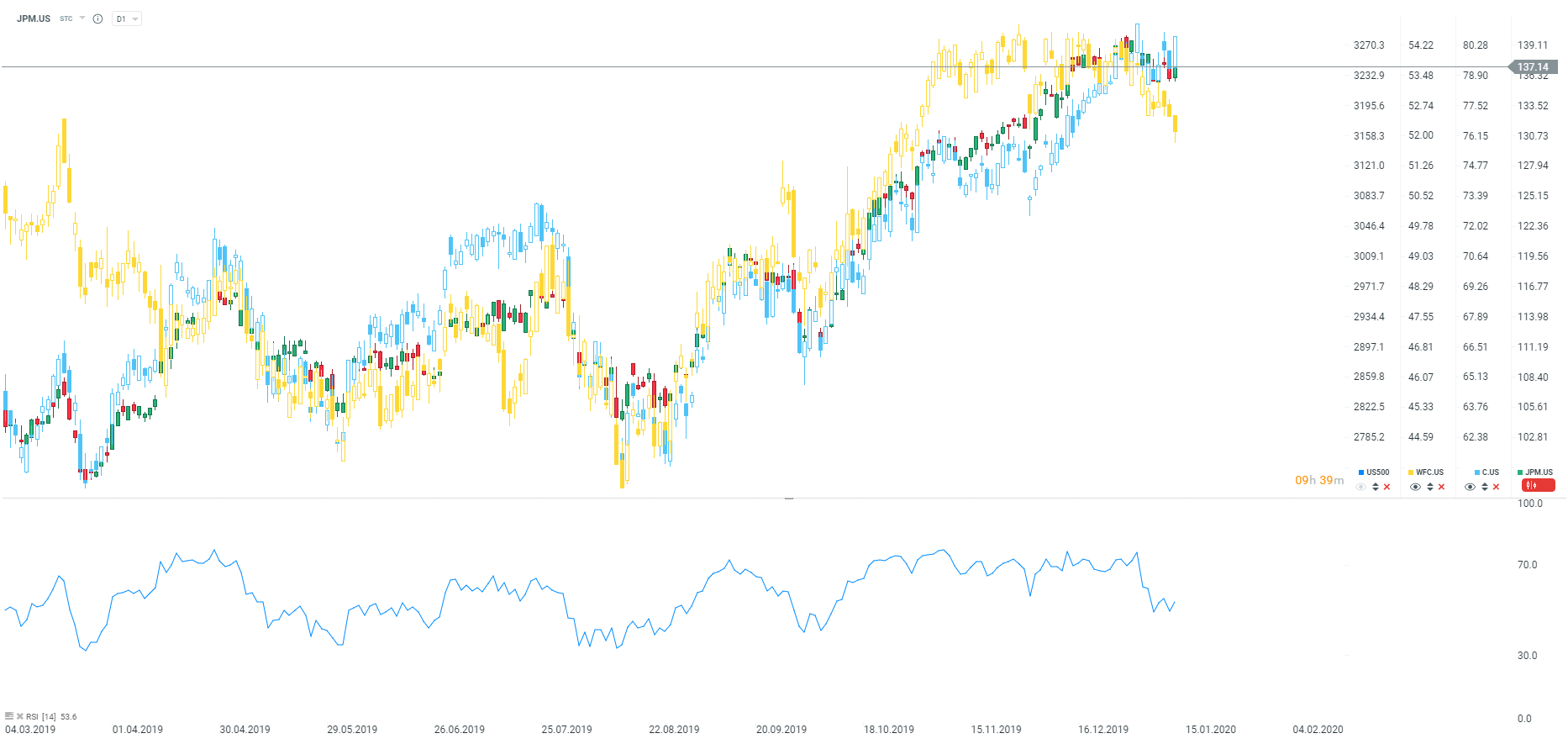 Banki rosły ostatnio wraz z dobrą sytuacją na S&P 500, choć indeks zachowywał się minimalnie lepiej, głównie ze względu na akcje spółek technologicznych. Nieco gorzej radzi sobie Wells Fargo. Można oczekiwać otwarcia luką spadkową dzisiejszego dnia. Źródło: xStation5