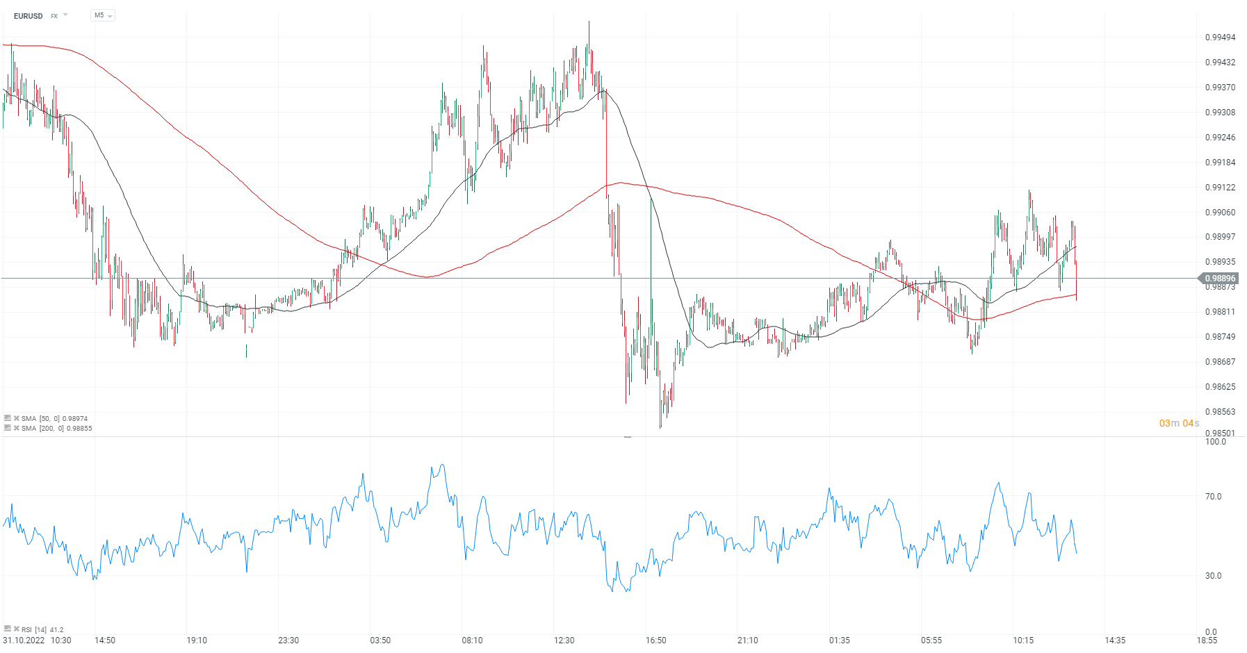 EURUSD, interwał M5. Para walutowa osuwa się poniżej 0.99. Źródło: xStation5