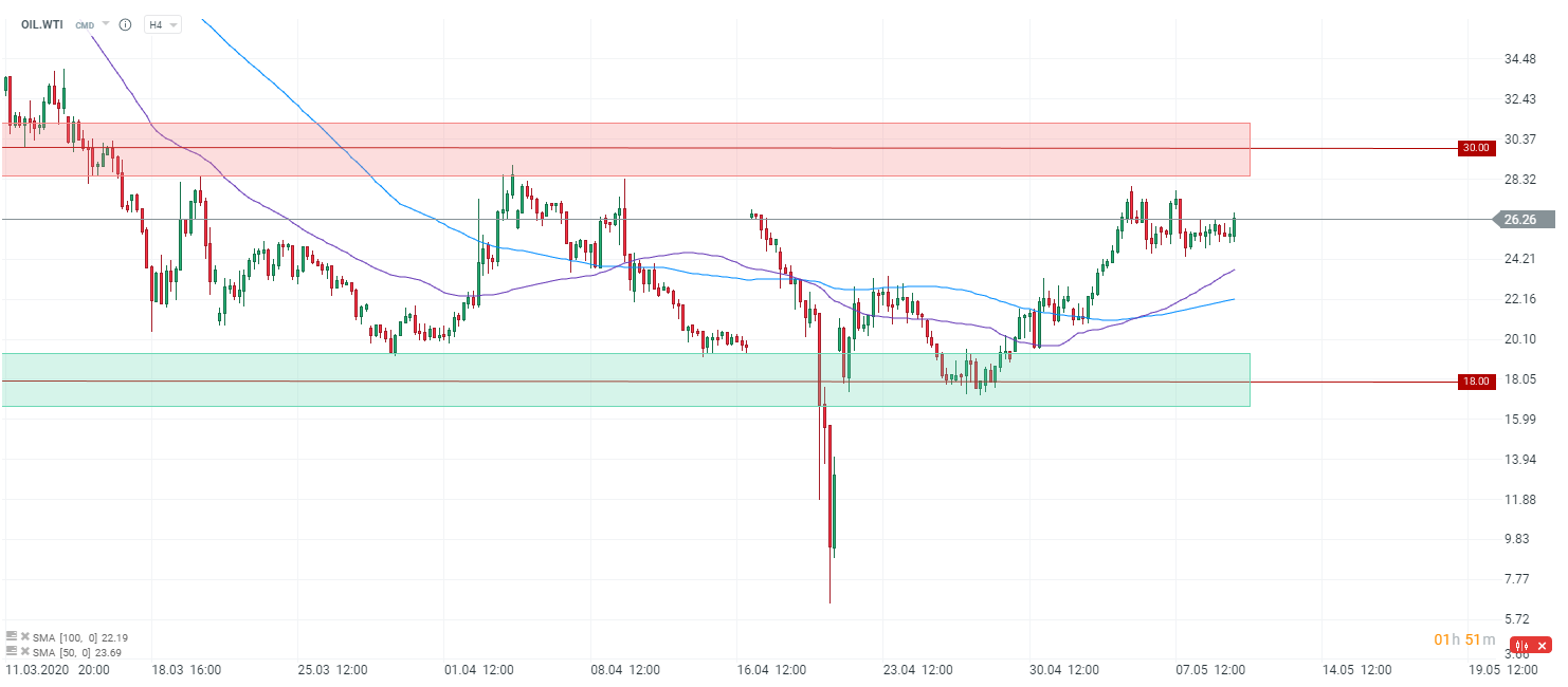Ropa reaguje pozytywnie na informacje dotyczące o dodatkowym cięciu produkcji. Cena ropy znajduje się wyraźnie powyżej 26 USD za baryłkę. Kluczowa strefa oporowa rozpoczyna się dopiero od okolic poziomu 28 USD za baryłkę, dlatego możliwa jest dalsza presja na wzrost cen w najbliższym czasie. Później jednak prawdopodobieństwo pojawienia się podaży będzie spore, bazując na spadki cenowe z okolic poziomu 28 USD za baryłkę od połowy marca. Źródło: xStation5