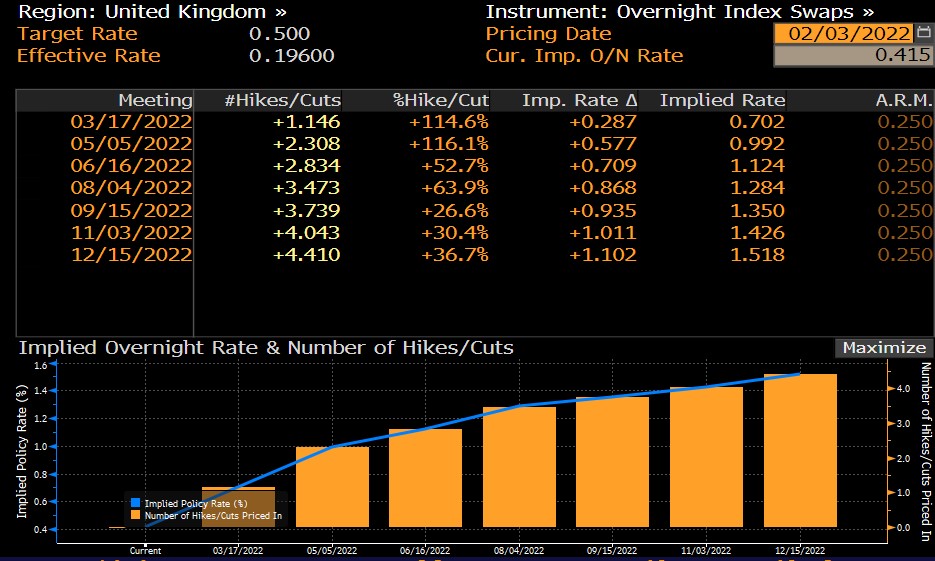 Aktualnie rynek wycenia jescze 4 podwyżki stóp w 2022 roku. Jeśli chodzi o prognozy, MPC widzi szczyt inflacji w okolicach 7,25% w kwietniu, wobec 5% poprzednio. Rada spodziewa się inflacji CPI w 2022 r. na poziomie 5,75%, wobec 3,5% w listopadzie. Bankierzy powiedzieli, że "umiarkowane zacieśnienie" jest prawdopodobne w nadchodzących miesiącach. Bank planuje pełne wycofanie się programu skupu aktywów, gdy stopa bazowa osiągnie 1%.