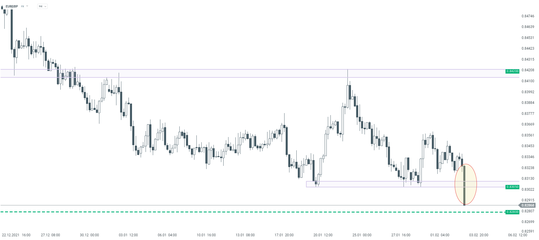 Ciekawie wygląda sytuacja techniczna na parze EURGBP, która znalazła się na lokalnych minimach. Notowania zmierzają aktualnie w stronę kluczowego wsparcia przy 0,8280, gdzie znajdują się minima z 2019 i 2020 roku. Na ten poziom zwracaliśmy uwagę w porannym webinarium.