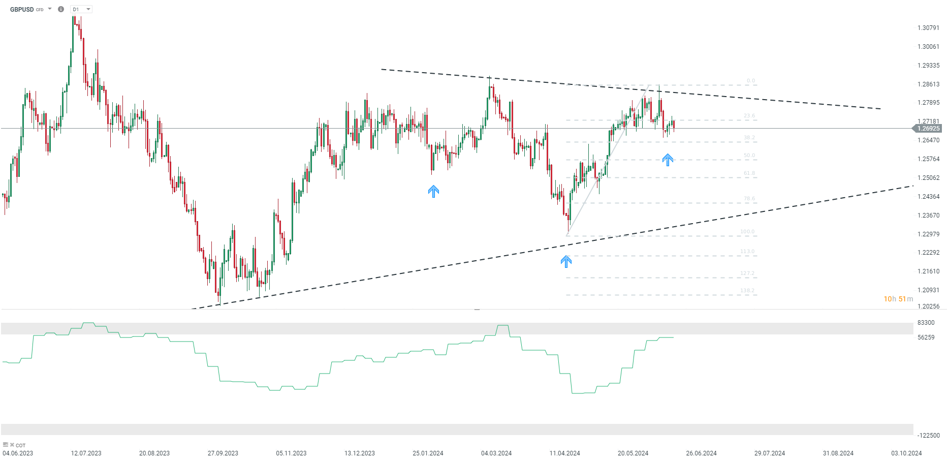 GBP osłabił się po decyzji, a para GBPUSD spadła straciła ok. 0,2%. Nie jest to jednak duży ruch z perspektywy ostatnich sesji, dlatego dalsze perspektywy mogą zależeć od amerykańskiego dolara. Kluczowe wsparcie krótkoterminowe to okolice poziomu 1,2645 przy zniesieniu 38.2. Rynek ponownie zaczął wyceniać dużą szansę na obniżkę stóp w sierpniu. Warto podkreślić, że decyzja ta będzie miała miejsce już po wyborach parlamentarnych.