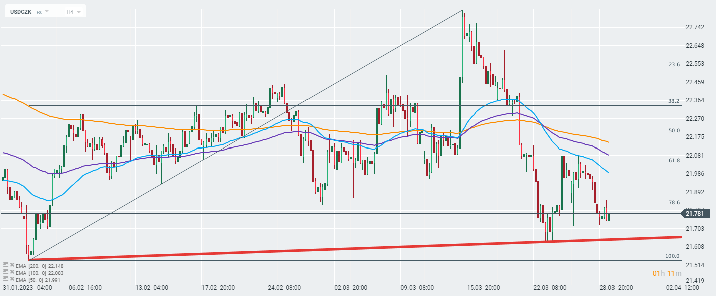 Wykres pary walutowej USDCZK. Interwał D1. Dzisiejsza decyzja Banku Czech nie wywołała podwyższonej zmienności na parze walutowej. Dolar próbuje bronić strefy wsparcia, wyznaczonej przez minima w zeszłym tygodniu. Źródło: xStation5