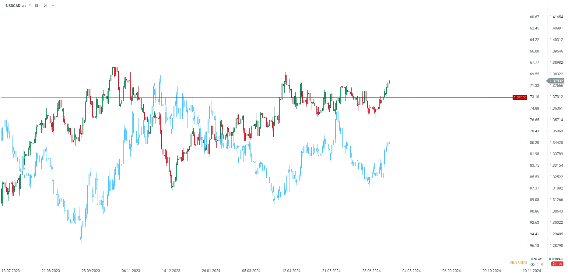 Generalnie widać, że mamy do czynienia z raczej gołębim przesłaniem, choć w dużej mierze było to oczekiwane, biorąc pod uwagę stan kanadyjskiej gospodarki. USDCAD rośnie w okolice dziennych szczytów, przebijając lokalne szczyty z 11 czerwca.