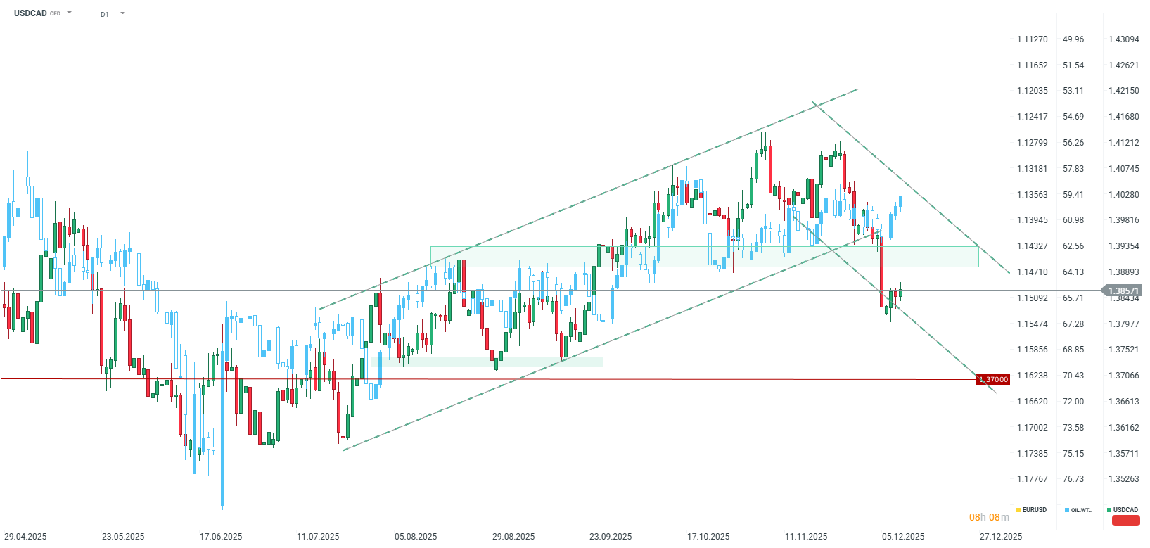 USDCAD nieco przedłuża dzisiejsze wzrosty na parze, które najprawdopodobniej w dużej mierze związane są z przedłużającymi się spadkami na rynku ropy naftowej. Widzimy, że w ostatnich miesiącach pojawiła się dosyć spora korelacja między ropą oraz USDCADem, ale w ostatnich dniach pojawiła się spora dywergencja, która sugeruje wyższe poziomy dla pary. Niemniej warto podkreślić, że dalsze losy pary w dużej mierze będą zależne od sytuacji w USA i decyzji Fed.